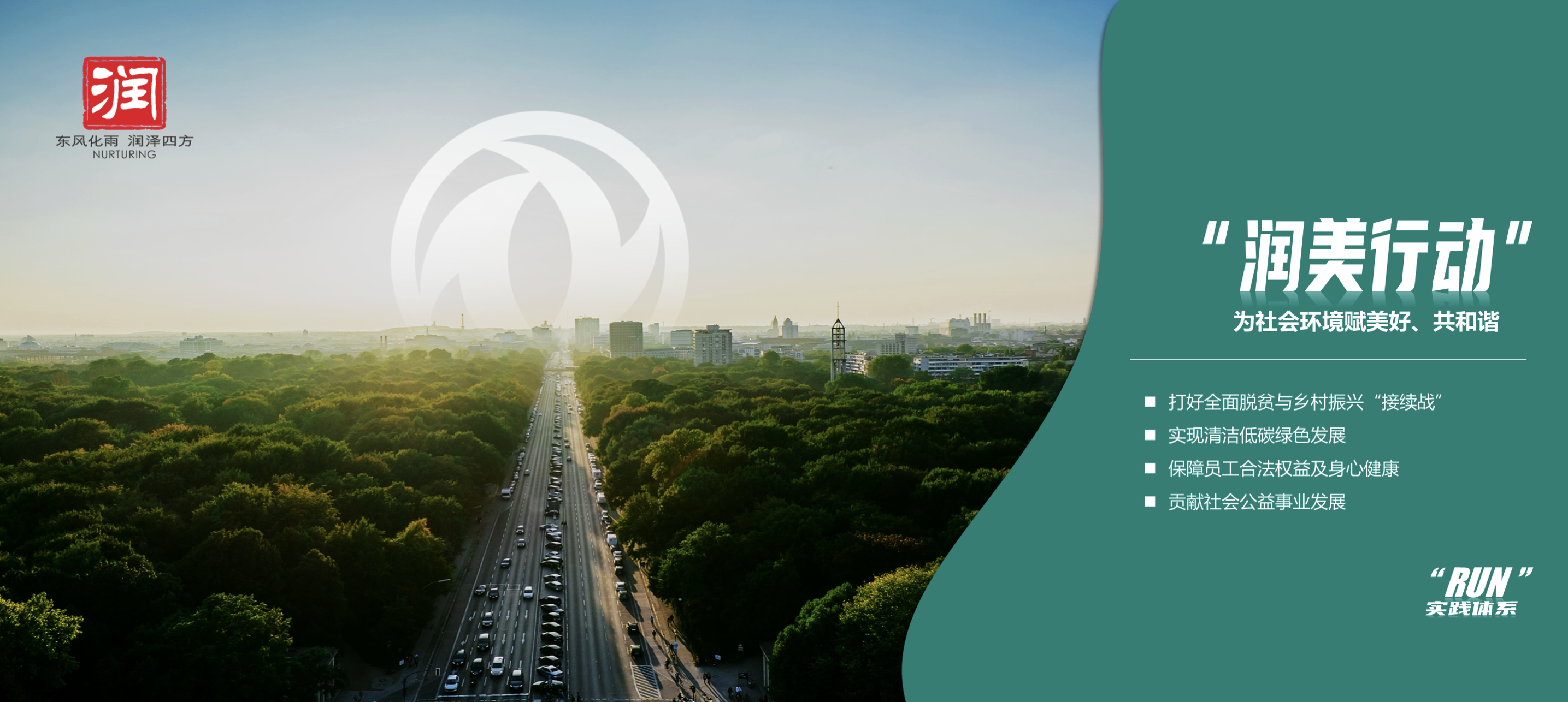 2021年(nian),東風公(gōng)司正式(shi)髮(fa)布了(le)新(xin)一(yi)輪社(she))會責任行動(dòng)計(ji)劃——“潤”計(ji)劃3.0。該計(ji)劃明确了(le)東風公(gōng)司新(xin)一(yi)輪社(she))會責任工(gong)作(zuò)的(de)戰略願景、目(mu)标路徑及(ji)實踐(jian)體(ti)係(xi),昰(shi)東風公(gōng)司下階段履責工(gong)作(zuò)的(de)實踐(jian)指南(nan),将開啓東風公(gōng)司社(she))會責任工(gong)作(zuò)髮(fa)展(zhan)的(de)新(xin)篇章。